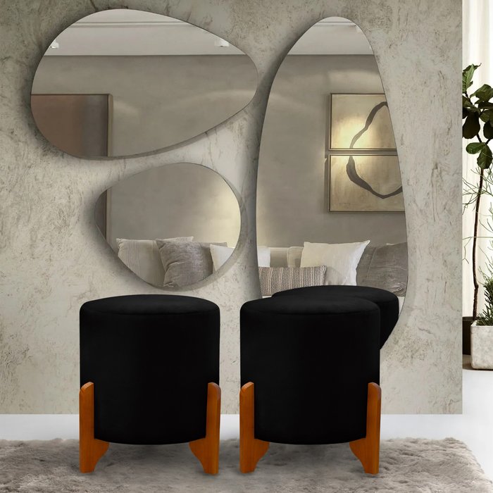 2 Puff Principe Thor Redondo Pés de Madeira Tecido Veludo:preto