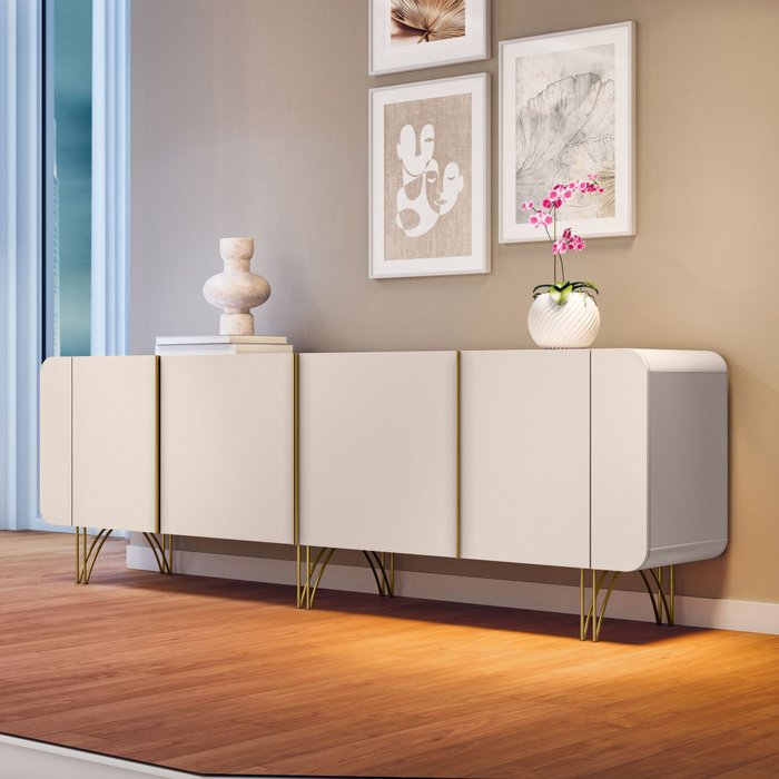 Com estrutura em MDF e MDP de 15 mm, o buffet oferece robustez e durabilidade. Possui quatro portas com dobradiças laterais e sistema de amortecimento, garantindo fechamento suave e silencioso. Os puxadores em alumínio com acabamento dourado agregam requinte ao design, enquanto os pés em aço maciço 3/8 conferem estabilidade e um toque industrial sofisticado. O acabamento com pintura UV proporciona maior resistência e durabilidade ao móvel, mantendo a beleza por muito mais tempo.