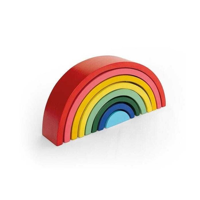 O arco iris, é formado por 8 arcos coloridos, sendo cada um representando uma cor do arco iris. Esse brinquedo permite as crianças a empilharem, construirem figuras e desconstruírem, formarem túneis, organizarem por cores, contarem, pode ser um elemento simbólico, estimulando a brincarem da maneira que desejarem. Pode ser utilizado também junto com outros brinquedos da linha Waldorf, explorando outros conceitos, brinquedos vendidos separadamente, verificar na categoria brinquedos por linha de aprendizagem, brinquedos Waldorf.