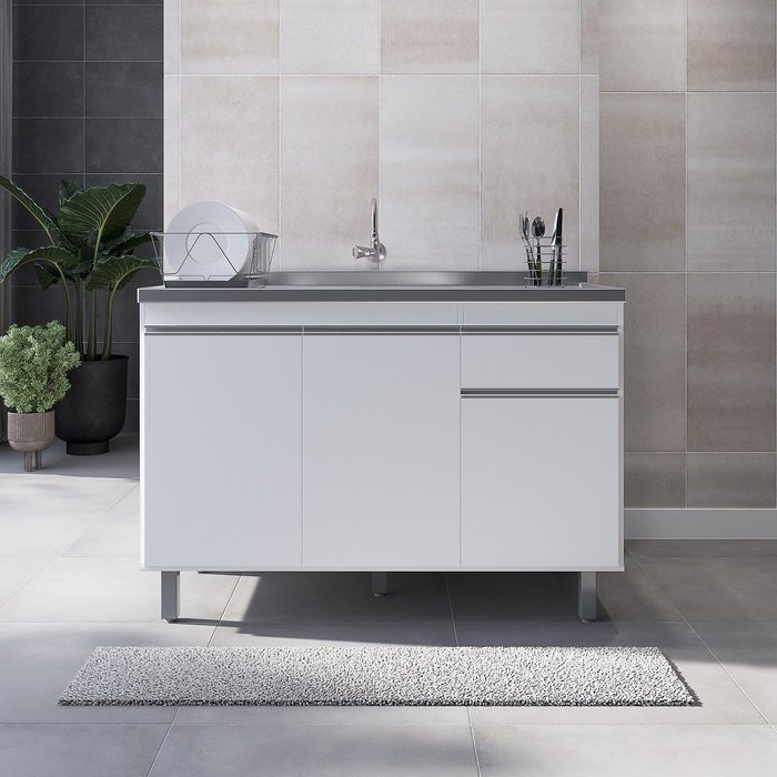 Armário P/ Pia Inox 120cm Branco 3 Portas 1 Gaveta S/ Tampo Branco