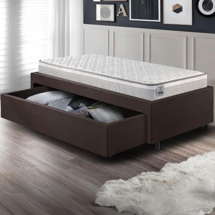Na parte superior, o box é projetado para acomodar um colchão de solteiro padrão 88x188 cm, mas sua estrutura externa possui dimensões maiores, 99x199x38 cm, garantindo um encaixe perfeito e maior estabilidade. Além disso, a gaveta inferior é ampla e ideal para armazenar diversos itens, como brinquedos, roupas de cama, livros e muito mais.
