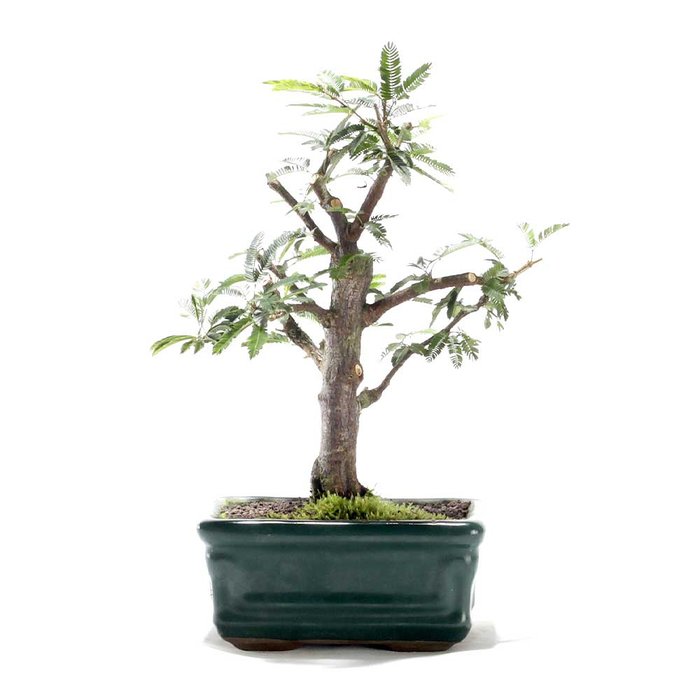 A caliandra Rosa é um pequeno arbusto de folhas perenes e delicadas, num verde exuberante, que se fecham à noite ou quando a planta sofre um déficit hídrico. Possui flores de coloração branca e rosa, com formato de pompom. Os brotos das flores que se desenvolvem no final da primavera e ao longo do verão parecem pequenas framboesas e surgem da axila das folhas. Das flores surgem frutos em forma de vagem, característicos das leguminosas que partem quando maduros, espalhando as sementes. A coloração do tronco, quando novo, é de um cinza claro, tornando-se quase negro, com o passar do tempo. O Bonsai de caliandra rosa propicia um brilho e um exotismo especial, que embeleza nossa coleção. Ambiente de cultivo Todo bonsai deve ser cultivado preferencialmente a pleno sol, porém, esta espécie desenvolve-se bem em ambientes internos desde que esteja junto a uma janela que possa ser aberta diariamente fornecendo iluminação e ventilação, tendo em vista que a planta necessitará de 2 a 4 horas de sol por dia. Esta espécie não tolera geadas, devendo ser protegida neste caso.