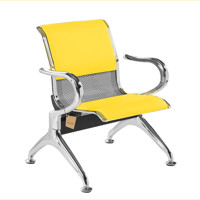 Cadeira de espera tipo longarina com assentos estofados e base fixa.