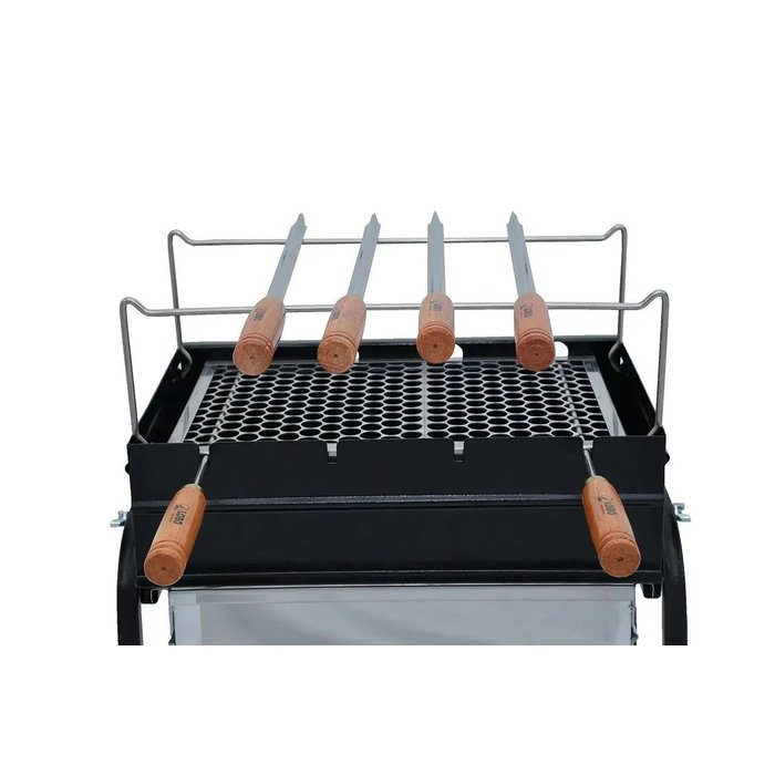 Itens Inclusos | 4 Espetos de Lâmina Inox; 2 Pés; 1 Braseiro para Carvão; 2 Suportes para Espetos. |