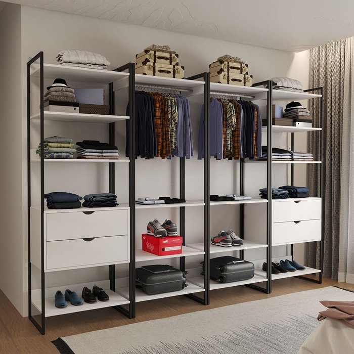 Closet Industrial Casal Completo Loft Branco 4 Módulos Cabideiro com Gavetas Ferro Preto BRANCO