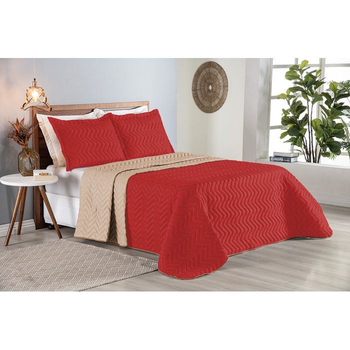 Colcha Cobre Leito Cama Queen 3 Pç Dupla Face Acolchoado Microfibra Vermelho e Bege