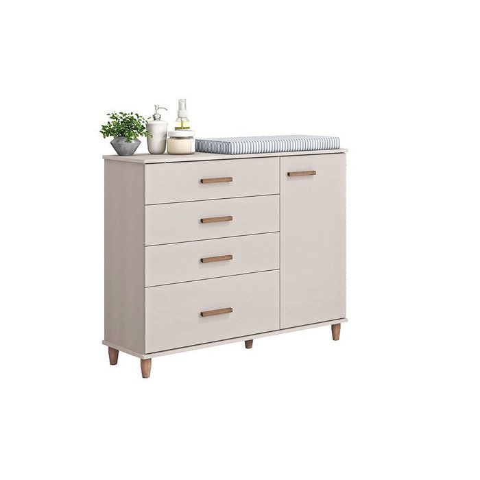 Possui 4 gavetas espaçosas com corrediças telescópicas, ideais para armazenar roupas, fraldas, acessórios e itens essenciais do bebê com praticidade e fácil acesso.