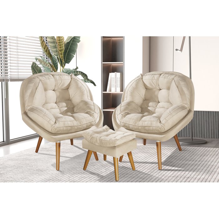 Conjunto Poltronas Sênior em Suede Premium com Puff e Pés de Madeira:bege