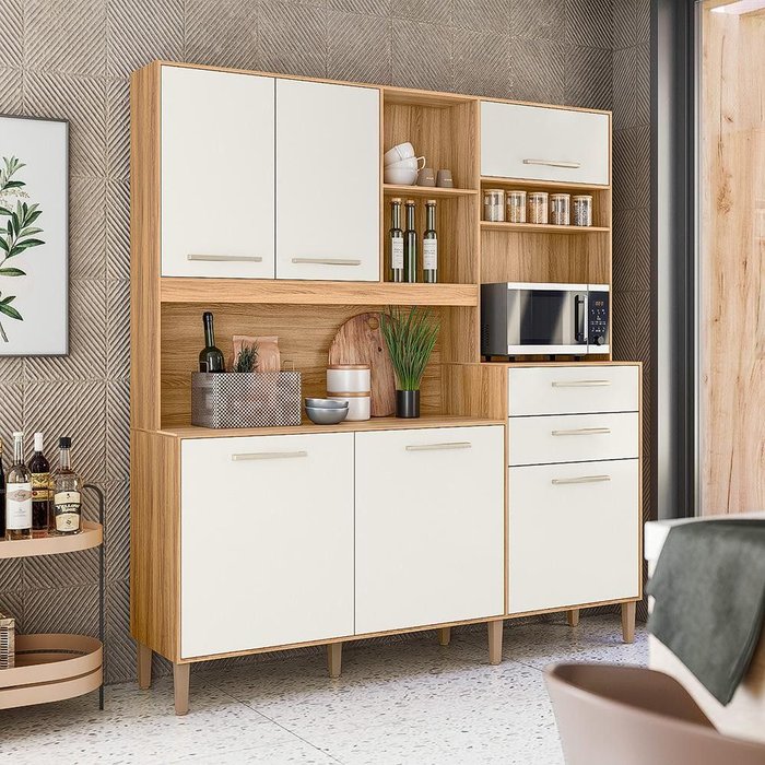 Produzida em MDP resistente com acabamento em pintura UV, a Cozinha Salsa tem visual elegante e estrutura reforçada. Seu design inteligente inclui nichos externos e prateleiras internas, ideais para armazenar utensílios, mantimentos e objetos de uso diário. Com pés de apoio, o móvel garante estabilidade e facilidade na limpeza do ambiente.