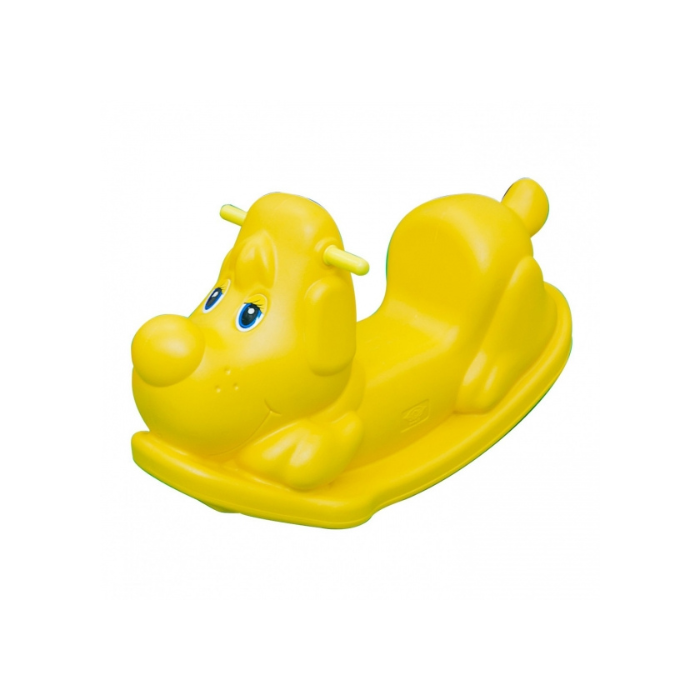 1 unidade de gangorra infantil no formato de cachorrinho, com base reforçada e acabamento arredondado, ideal para uso em ambientes internos e externos.