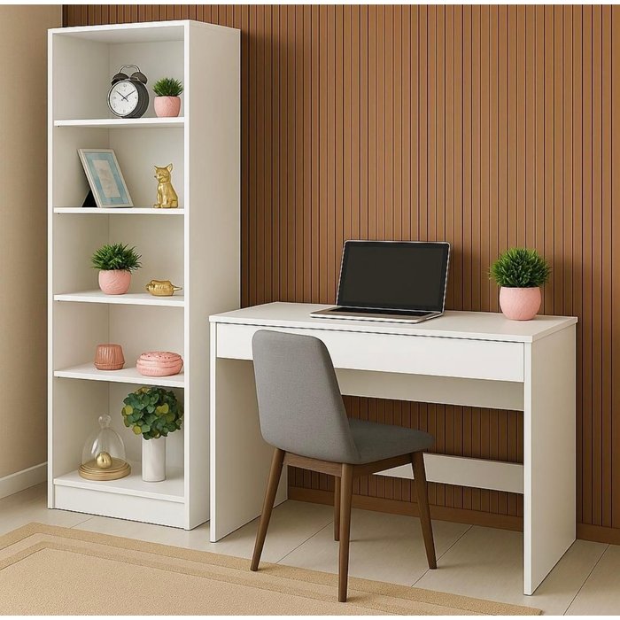 Transforme seu espaço com a escrivaninha com gaveta telescópica, ideal para quem busca praticidade e organização no dia a dia. Combine com o livreiro ripado com 5 prateleiras, perfeito para expor livros, objetos decorativos e manter tudo ao alcance.