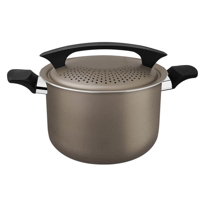- Cozinhe massas com maior facilidade na espagueteira Tramontina Milazzo em alumínio com revestimento interno e externo em antiaderente Starflon Max amêndoa 22 centímetros de diâmetro.