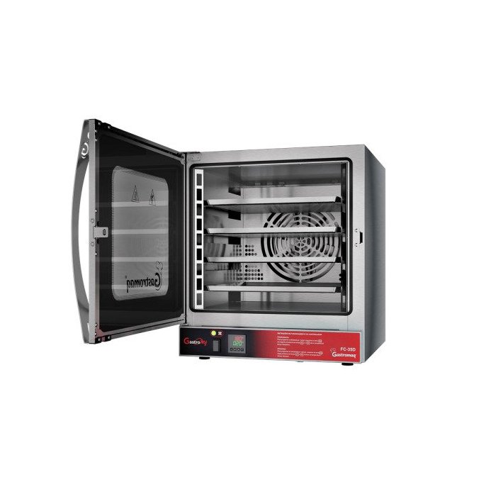 O Forno Digital FC35D da Gastromaq é ideal para assar ou finalizar de forma rápida e uniforme, alimentos servidos a todo momento como pães de queijos, cookies, folhados, pastéis, pizzas, croissant e outros doces e salgados. Ele foi projetado para assar alimentos de maneira rápida, com qualidade e excelência e economia. Sua potência é de 2600W com funcionamento por convecção e também possui controlador digital de temperatura. A capacidade deste forno é um destaque desse equipamento, com capacidade de 4 assadeiras de 35X35cm e espaço de 7,5 mm entre elas. Possui sua estrutura em Inox, sendo um equipamento resistente e durável. Acompanha 4 assadeira 35x35mm de alumínio perfurado Distancia de 7,5mm entre as assadeiras Estrutura total inox Empilhamento de até 2 fornos Temperatura ajustável até 250ºC Excelente Isolamento térmico Pratico e eficiente Versátil