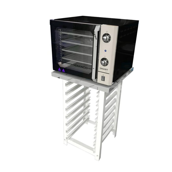 COMPONENTES DO KIT- 1 Forno Turbo Elétrico Convector Smart Basic 4 Esteiras FCSB4E VENANCIO - 220V - 1 Mesa Tampo em aço inox Mes-004 - ProgásForno Turbo Elétrico Convector Smart Basic 4 Esteiras FCSB4E VENANCIO - 220Vobs: COR DO PRODUTO PODE VARIAR DE ACORDO BRILHO SEU MONITOR (CELULAR OU TELA COMPUTADOR).Descrição e Característica Ficha Técnica:- Indicado para doces, bolos, salgados, pizzas e massas; - Acabamento interno em aço inox; - Acabamento externo preto com detalhe painél color; - Isolamento térmico em lã de rocha; - Iluminação interna; - Acompanha 4 esteiras de 35x35 cm, em alumínio perfurado; - Termostato temperatura até 250ºc, com sistema de segurança; - Temporizador de até 120 minutos; - Chave Liga e Desliga da turbina (ventilador interno). - Possui sistema de ar forçado, responsável por assar uniformemente; - Puxador em aço inoxidável 430; - Capacidade de 55 litros.Tensão 220V, monofásico; - Frequência: 60Hz; - Motor: 1/30 cv; - Potência do motor: 80 W; - Potência da resistência: 2000 W; - Potência da Lâmpada: 18 W; - Potência Total: 2100 W; - Consumo: 2,1 Kw; - Disjuntor: 16A; - Peso Bruto: 30Kg - Peso Líquido: 26Kg - Medida Externa: 46,3cm A x 60cm L x 66,7cm P - Medida interna: 40cm A x 40cm L x 39,5cm P. - Medida Embalagem: 55cm A x 66cm L x 68cm PMesa Tampo em aço inox Mes-004 - Progás- Tampo em aço inox escovado; - Estrutura em aço carbono com pintura epóxi; - Sapatas plásticas. - capacidade para 8 esteiras.Medidas Totais: 90,6 cm A x 60 cm L x 60 cm P Medidas da Embalagem: 14 cm A x 63 cm L x 90 cm P Peso Líquido: 16 kg Peso Bruto: 18 kg