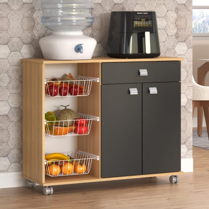 A Fruteira Isis é o móvel perfeito para quem busca praticidade, organização e elegância na cozinha. Com um design moderno e funcional, ela é ideal para armazenar frutas, legumes, utensílios e mantimentos de forma acessível e bem organizada.Com amplo espaço interno, a Isis conta com duas portas com prateleira, três cestos metálicos aramados para frutas e legumes, e uma gaveta com corrediça metálica, perfeita para guardar talheres, guardanapos e pequenos acessórios de cozinha. Além disso, seu tampo resistente suporta até 20kg, sendo ideal para micro-ondas, galão de água ou eletrodomésticos.