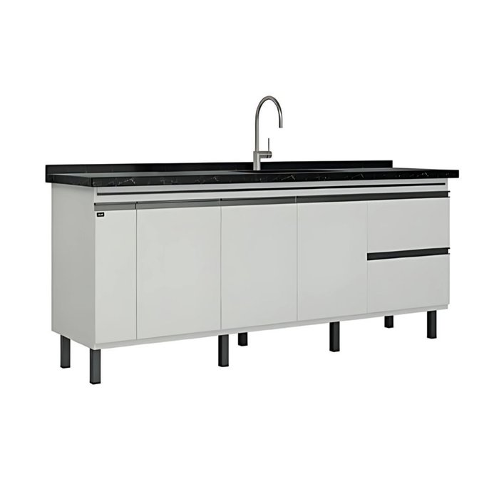 Com 1 porta para temperos, 3 portas convencionais e 2 gavetas com corrediças telescópicas, oferece excelente espaço interno. As dobradiças com amortecimento proporcionam fechamento suave, prolongando a vida útil do móvel.