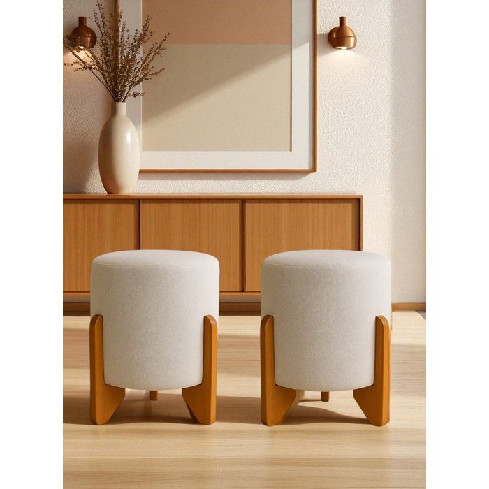 Kit 02 Puff Piave Decorativo Tecido Linho Banqueta Redondo Pés de Madeira Maciça