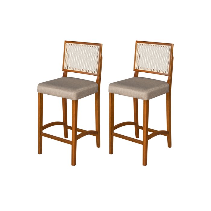 Kit 2 Banquetas Alta Roma Rattan Luxo Balcão Banco Pés Madeira em Madeira Maciça Premium Cor Bege Imbuia