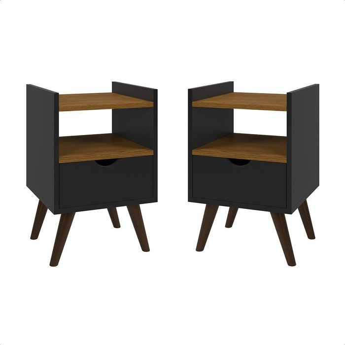 Kit 2 Mesa Cabeceira 1 Gaveta 1 Nicho Pés Retro Preto/Freijó