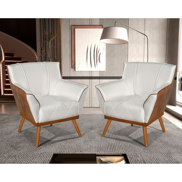 Kit 2 Poltrona Berlim Compose Luxuosa Linho Bege Pés Madeira