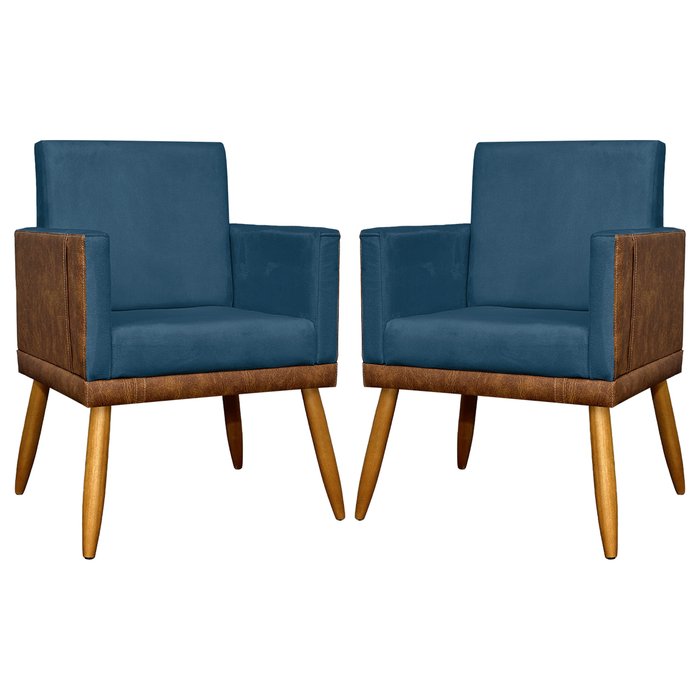 Kit 2 Poltronas Decorativas Lis Corino e Suede Cores Pé Palito 30cm Azul Marinho