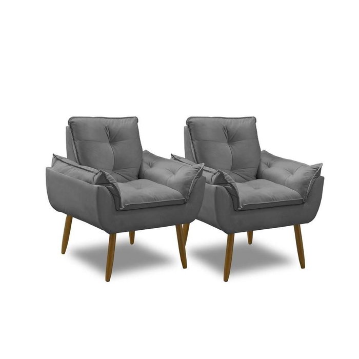Kit 2 Poltronas para Sala Decorativa Opala Pés Madeira Suede Cinza Chumbo Império Decor