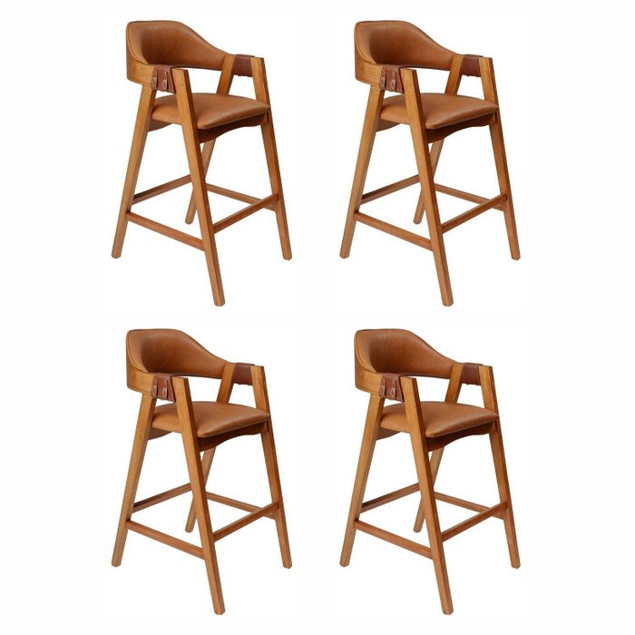 Kit 4 Banquetas de Madeira Maciça Tauari, Estofada e Braço de Couro Original Bélgica