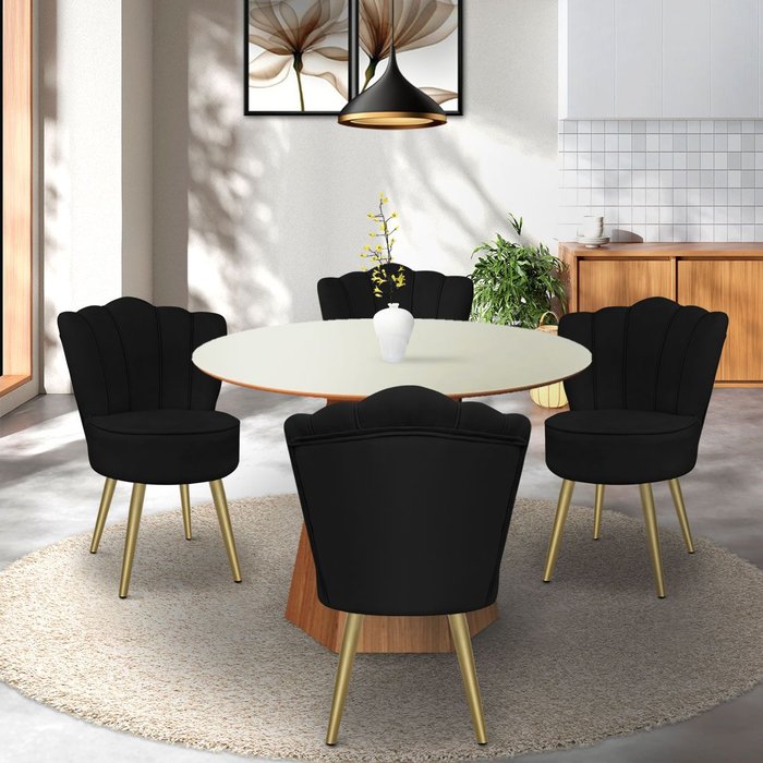 Kit 4 Cadeiras de Jantar Pétala com Pés em Aço Dourado Veludo Preto Bz Home Decor