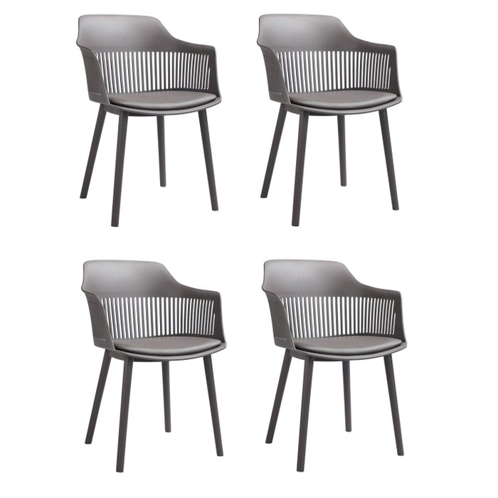 Conjunto com 04 cadeiras para uso em ambientes internos, com encosto não reclinável, assento injetado em polipropileno (PP), com almofada fixa no assento revestida em PU, sem ajuste de altura, com encosto para as costas. não possui braços, para uso doméstico.