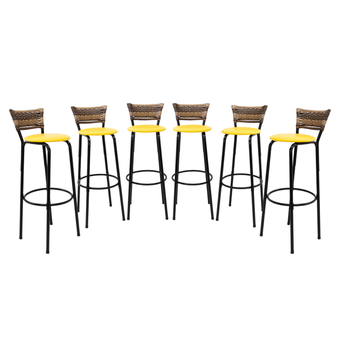 Kit 6 Banquetas 80cm para Balcão Ilha Bancada Área Gourmet Encosto em Junco Banco Itagold Assento Amarelo