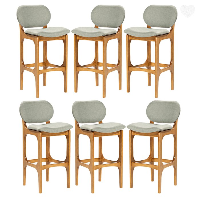 Kit 6 Banquetas Alta Estofada Rafine Madeira Maciça Castanho Linho Verde