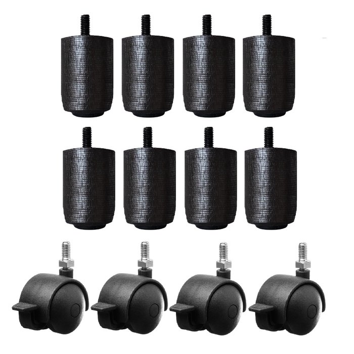 Kit 8x4 Pés P63 Preto C/ Trava para Cama Box ou Baú Queen ou King (8 Fixos de Madeira e 4 Rodinhas) PRETO