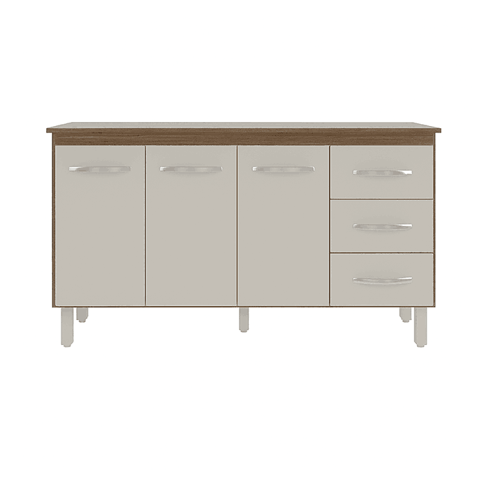 Composto por 2 portas, 3 gavetas e 1 prateleira interna, proporciona excelente espaço de armazenamento para utensílios, panelas e mantimentos. Os 5 pés plásticos com regulagem garantem estabilidade e permitem ajustes para nivelamento, com altura de 16,5 cm que pode chegar até 18 cm.