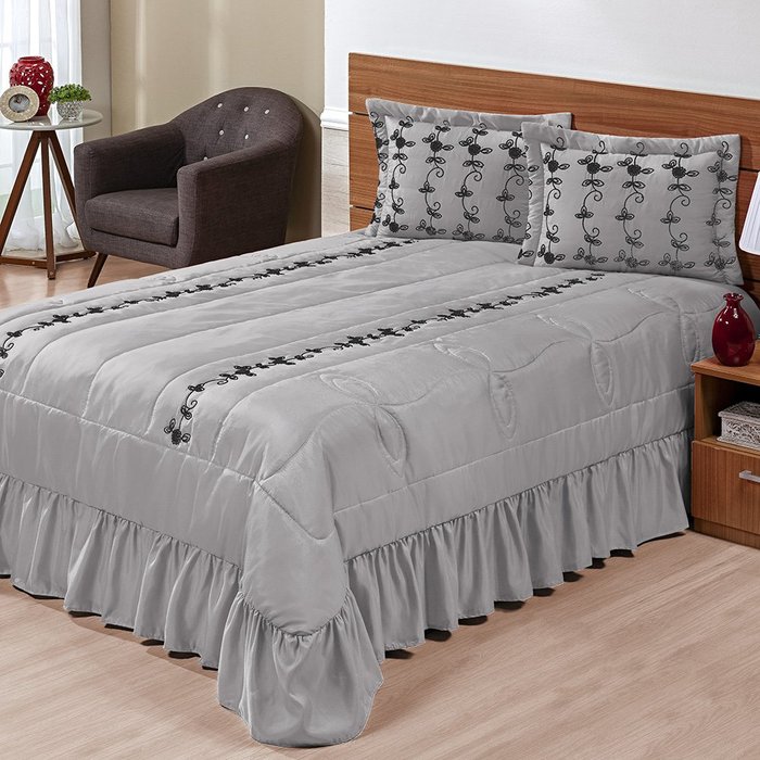 Kit Cobre Leito Casal Padrão Lisse 03 Peças Colcha Cinza Cinza