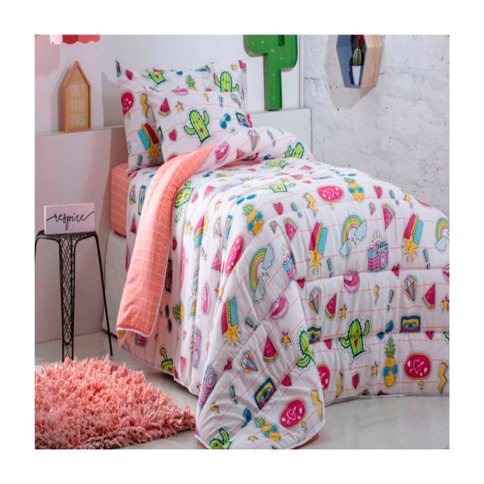 Kit Colcha Solteiro Infantil 240x160cm Patchwork Ultrasonic Cactus Happy Day