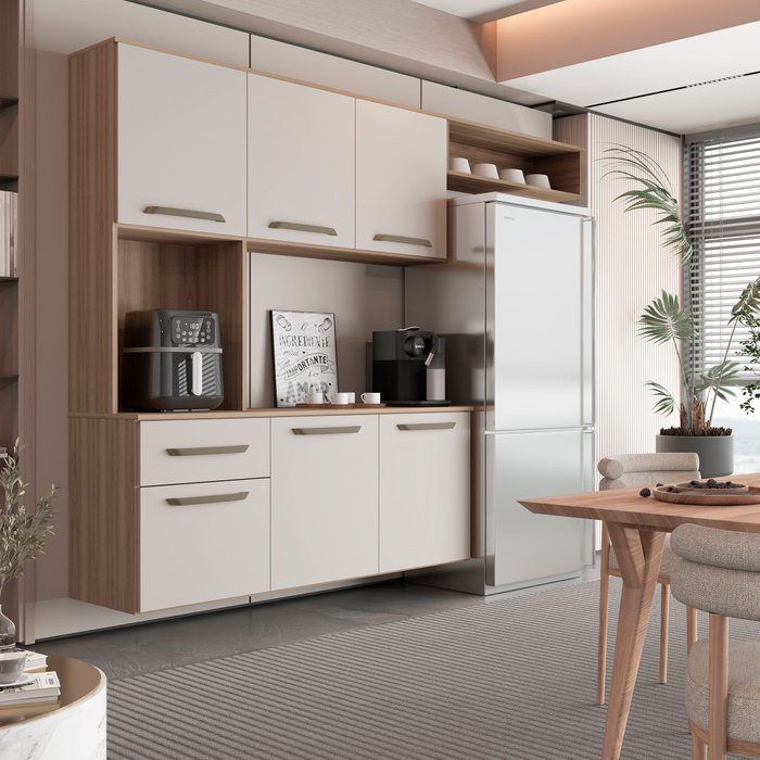 Com puxadores cromados em plástico e pés resistentes, a Cozinha destaca-se pelo seu visual clean com várias cores, trazendo leveza e elegância para a sua casa.