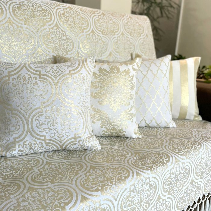 Modelo | Kit Manta Adamascado e 4 Capas de Almofada Luxo Branco e Dourado 45cmx45cm |