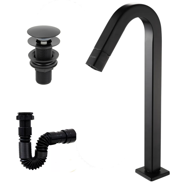 01 Torneira Lavatório Quadrada Preto Fosco 01 Válvula Click ABS com Tampa Inox 304 – 7/8" 01 Sifão de Alta Qualidade