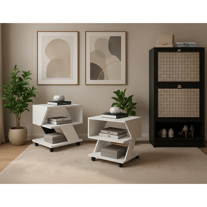 Kit Sapateira Spin Tropical 2 Portas e 2 Mesas de Cabeceira/centro Poquema Branco/Preto