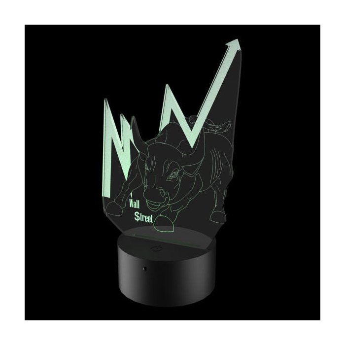 O Charging Bull de Wall Street é um dos maiores símbolos do mercado financeiro. Instalado há 30 anos em frente à entrada da bolsa de valores de Nova York, foi criado por um artista italiano. O símbolo foi abraçado por investidores do mercado financeiro e também criou uma tradição para turistas, que visitam a escultura e costumam tirar fotos com ela. As luminária são fabricadas em acrílico transparente de alta qualidade e com processo de gravação a laser. Possui 16 opções de cores que podem ser alternadas por controle remoto que acompanha a peça.