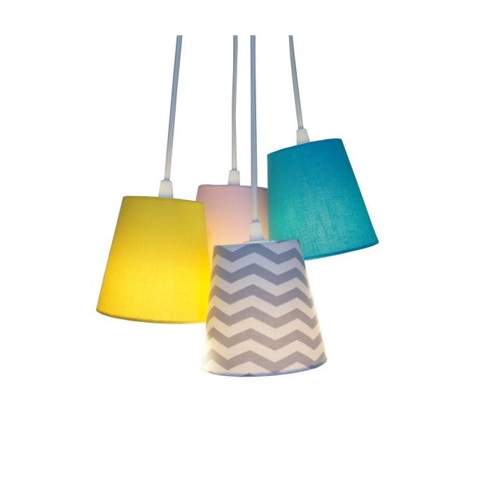 Lustre pendente com 4 cúpulas em formato em cacho. 1 cúpula rosa bebê , 1 cúpula cinza, 1 cúpula amarela, 1 cúpula azul turquesa e 1 cúpula em chevron cinza e branco.Perfeito para iluminar e decorar sua casa de uma maneira exclusiva. Dimensões de cada cúpula: Altura: 12 cm Diâmetro Superior: 8 cm Diâmetro Inferior: 12 cm O comprimento total da luminária é ajustável no momento da instalação. Cada cabo tem 90 cm de comprimento.Usar lâmpadas led ou fluorescentesCanopla e fios na cor brancaBivolt