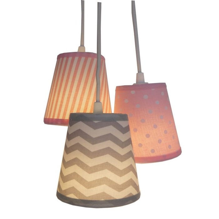 Lustre pendente com 3 cúpulas revestidas com tecido em formato de cacho. 1 cúpula em tecido poá rosa 1 cúpula em tecido listrado rosa 1 cúpula em tecido chevron cinza Perfeito para iluminar e decorar o quartinho do seu bebê. Dimensão de cada cúpula: Altura: 13 cm Diâmetro inferior: 13 cm Diâmetro superior: 8 cm O comprimento total da luminária é ajustável no momento da instalação. Cada cabo tem 90 cm de comprimento. Usar lâmpadas fluorescentes ou led até 25 w. Soquete E-27 Canopla de teto e fios brancos. Bivolt.