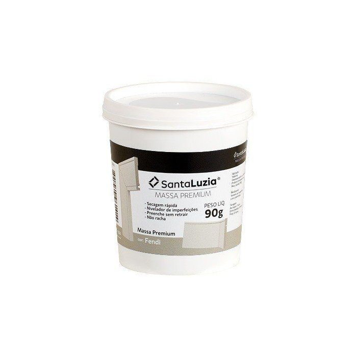A massa premium, possui cor fendi e um peso unitário de 90 gramas, é recomendada para preenchimento, vedação e acabamento em orifícios, fendas e fissuras presentes em uma variedade de superfícies, como alvenaria, madeira e gesso. Este produto é especialmente indicado quando se instalam perfis de poliestireno, como rodapés, rodameios, rodatetos, guarnições e revestimentos da Santa Luzia. Cada caixa contém 6 unidades para facilitar o manuseio. De fácil aplicação, as massas Santa Luzia foram projetadas para oferecer um acabamento impecável, com aderência eficaz em madeira, MDF, gesso, drywall, alvenaria, esquadrias, janelas, móveis e outros. Estes produtos são compatíveis com pintura e podem receber revestimentos adicionais após a aplicação. Além disso, não sofrem amarelamento e são adequados tanto para uso interno quanto externo.
