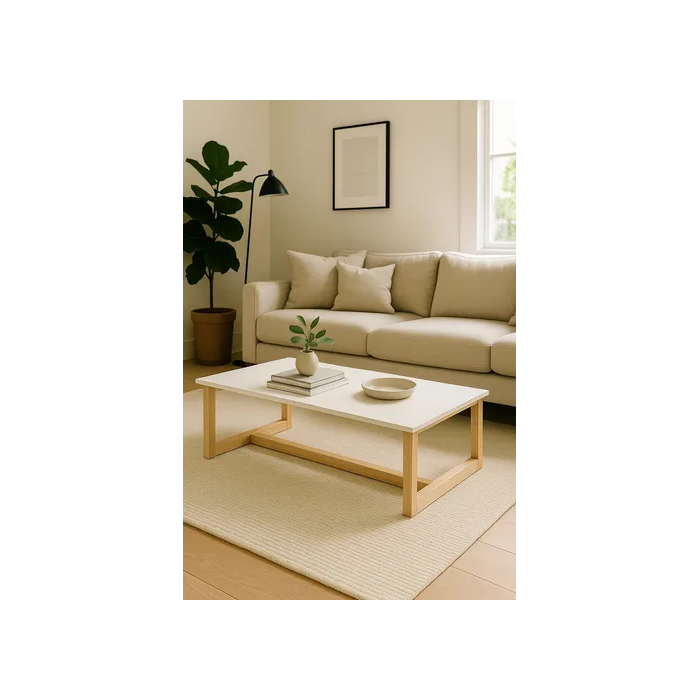 Mesa de centro retangular com design moderno e minimalista, ideal para compor salas de estar com elegância e funcionalidade. Possui tampo branco em MDP com 90 cm de comprimento, 60 cm de largura e 12 mm de espessura, oferecendo um visual clean e fácil de combinar. A base em madeira pinus natural mede 84 cm de comprimento, 48 cm de largura e 30 cm de altura, garantindo resistência e charme ao ambiente. Uma peça versátil que une beleza e praticidade para o seu espaço.