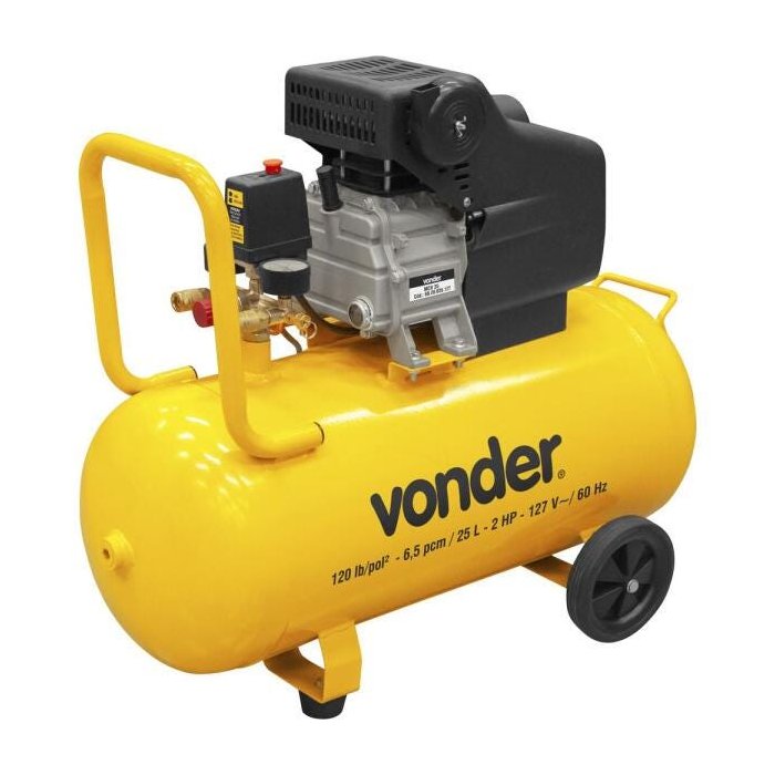 Conteúdo Embalagem:1 Motocompressor de arDestaques e diferenciais:Compacto e portátil, com potência de 2 cv (hp). Possui manômetros, regulador de pressão, chave liga/desliga, além de rodas e alça que facilitam o manuseio e o transporte. Conta com dispositivo de segurança (relé térmico), que desliga automaticamente o motor quando há sobrecarga ou superaquecimento.Aplicações e dicas de uso:Indicado para uso não contínuo em limpezas de peças, pequenas pinturas, pulverizações e acionamento de ferramentas pneumáticas, além de atividades como: encher balões, bolas, boias, pneus de carros e bicicletas, entre outras, respeitando a capacidade do modelo. Equipamento com óleo. Características Técnicas: Linha : Profissional leve Capacidade de produção de ar do motocompressor (deslocamento teórico): 6,5 pcm (pé³/min) Pressão máxima do motocompressor de ar (PSI): 120 lbf/pol² Pressão máxima de trabalho do motocompressor de ar (PSI): 80 lbf/pol² Capacidade do reservatório do motocompressor de ar: 25 litros Potência do motor do motocompressor de ar: 2,0 cv (hp) Número de pistões do motocompressor de ar: 1 pistão Número de estágios do motocompressor de ar: 1 estágio Rotação do motocompressor de ar (rpm): 3.420/min Material do cabeçote do motocompressor de ar: Alumínio Tipo de saída: 2 saídas com engate rápido de 1/4" Tensão (V): 127 V~ Garantia:Garantia legal: 90 dias + Garantia contratual: 9 meses
