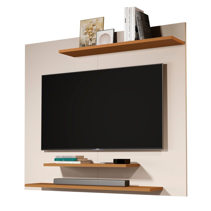 O painel conta com três prateleiras integradas, perfeitas para acomodar itens de decoração, livros, controles, roteadores ou aparelhos eletrônicos como soundbar e TV Box.
