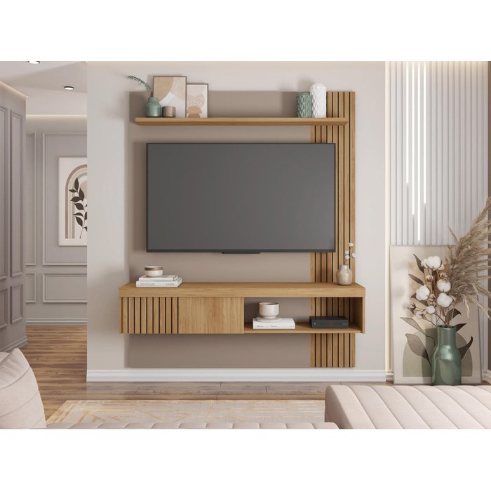Painel para Tv Moderno até 55 Polegadas Suspenso Sala Quarto Ripado Rack Cor Fendi/buriti