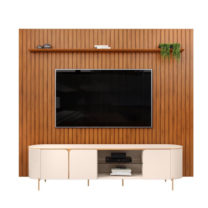 Painel Trento Ripado C/ Bancada Ariana 100% Mdf 2.75x2.40 Mts P/ Tv Ate 75 Polegadas - Off/freijo