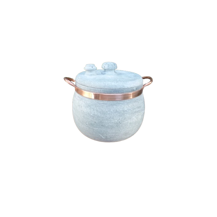 Panela de pressão em pedra sabão com longa durabilidade; retém o calor por longo tempo deixando o alimento quente por muito mais tempo.