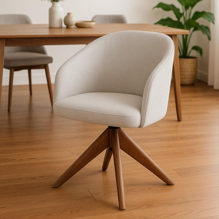 A Poltrona Zara une sofisticação, conforto e design funcional em uma peça que se destaca em qualquer ambiente. Com estrutura giratória em madeira maciça de eucalipto e revestimento em linho de alta qualidade, ela valoriza o espaço com elegância e leveza visual.